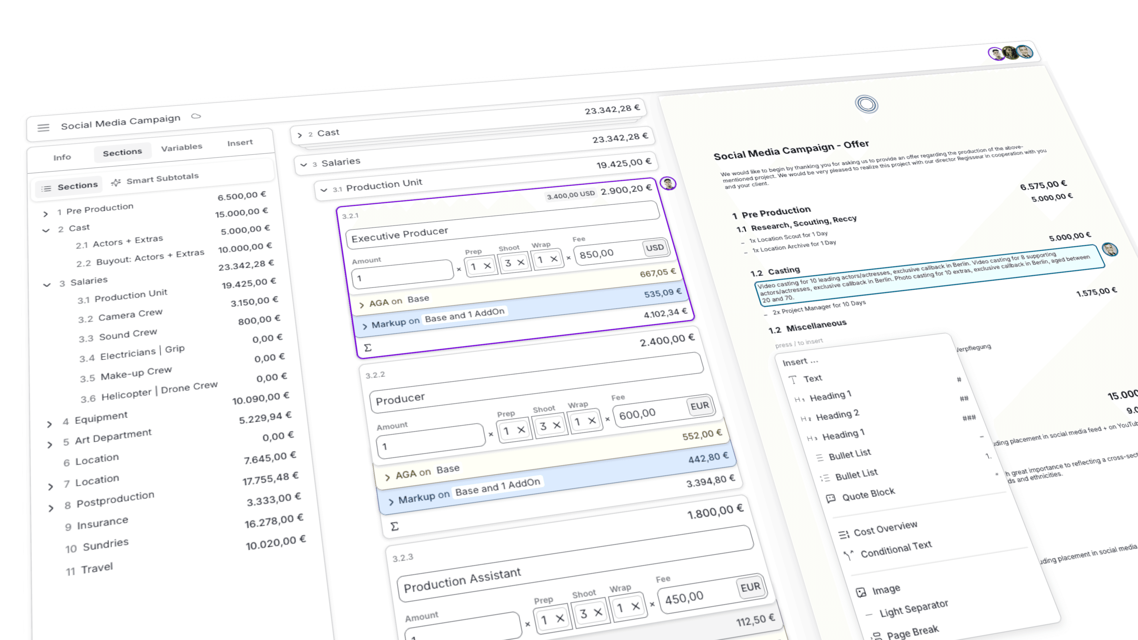 Forget fragile spreadsheet code. Create and manage your own custom variables. From specific Union Rates to the number of Shooting Days. Link them by just typing @. It is the flexibility of a custom system, with the simplicity of a mention.