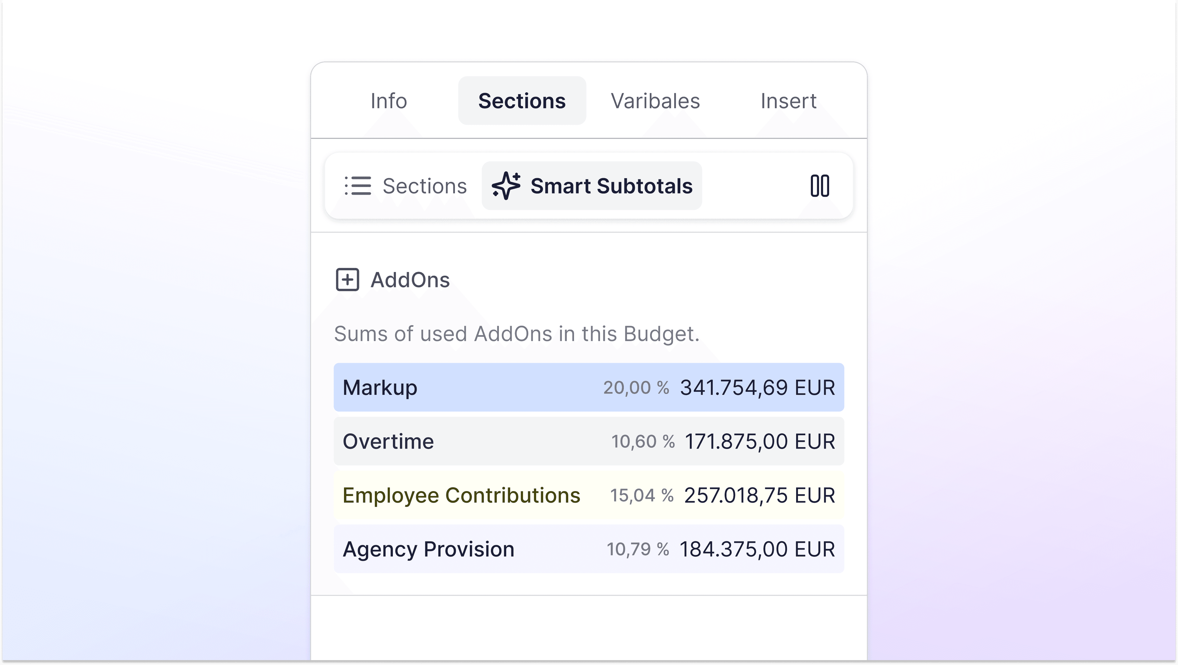 Precision requires more than just summing numbers. It requires the right logic. Splinde uses Add-Ons to handle the heavy lifting of production finance.