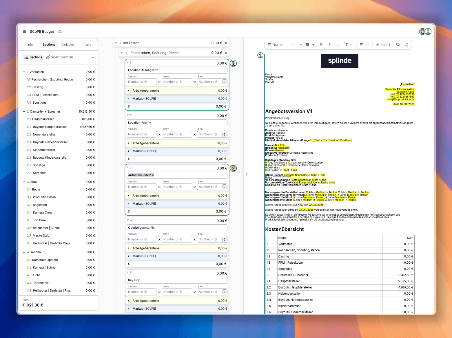 Move beyond the grid. Your live-synced SCoPE budget feeds directly into Splinde’s Document Editor. Generate a pristine, client-ready offer document that reflects the premium nature of your production.